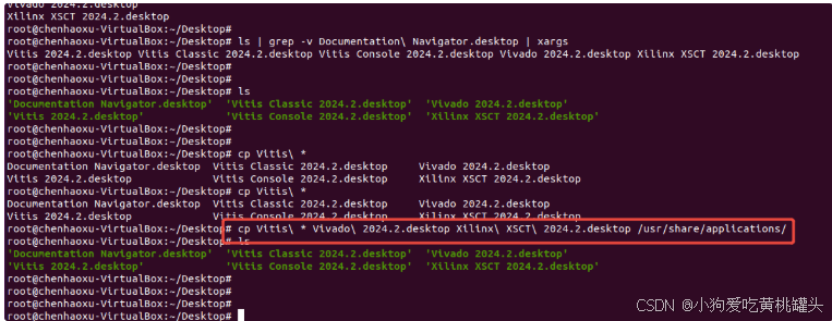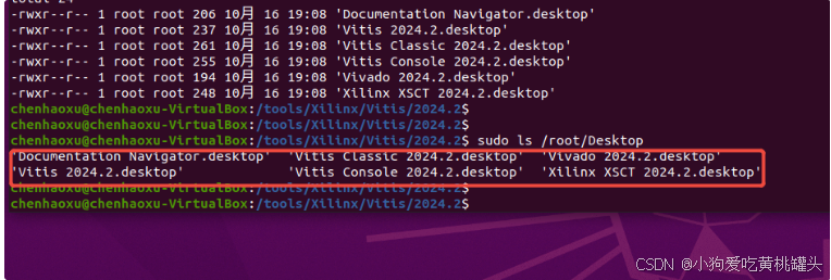 如下图Xilinux Vitis 2024.02 桌面快捷方式其实都已经创建出来了,但都在 ‘/root/Desktop’ 用户目录下,普通权限用户看不到。