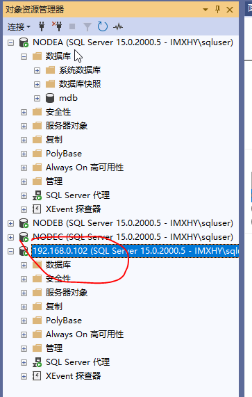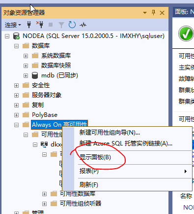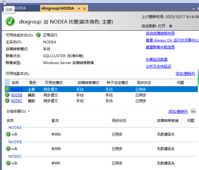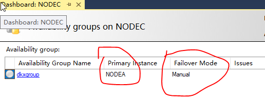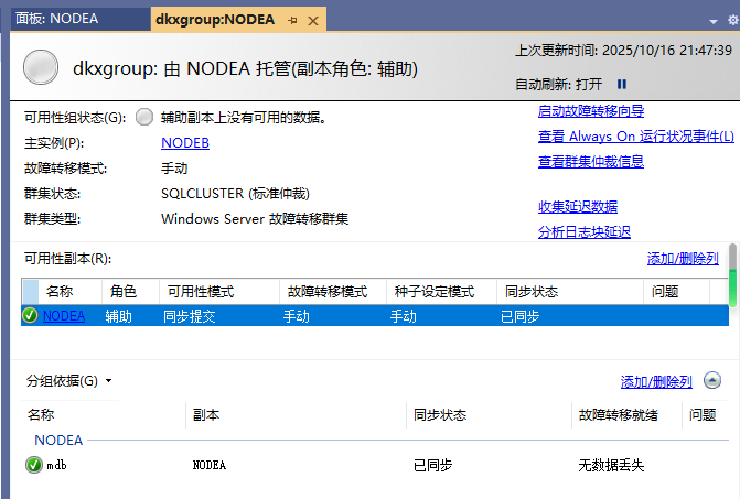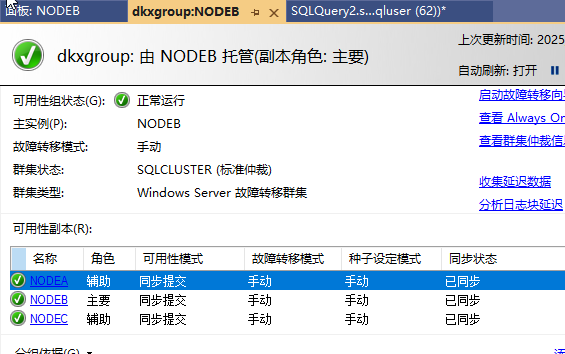 当前主实例--nodea,故障转移方式:manual(手工)---ssms 19.3英文版