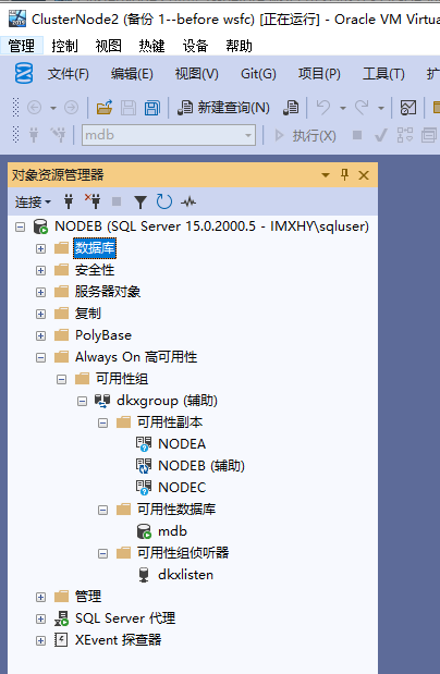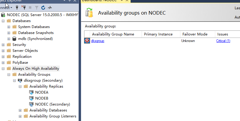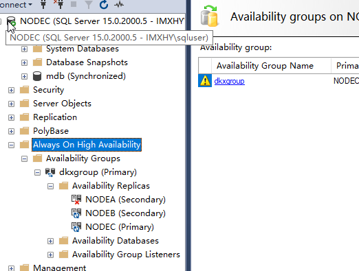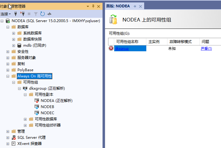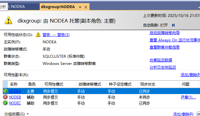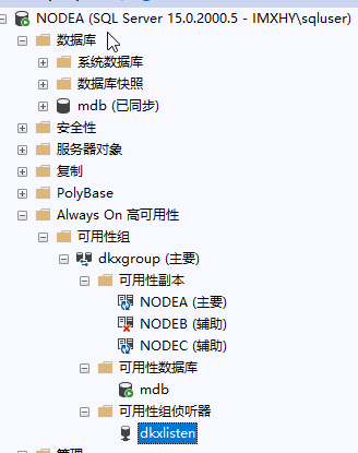 有一个可用性组dkxgroup,组内可用性副本3个为nodea,nodeb,nodec,其中nodea是主要实例,其它是辅助实例