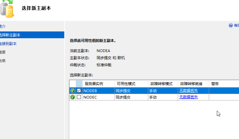 失败了,在nodeb一直是还原中(需要手动,因为配置的是故障转移方式是手动)