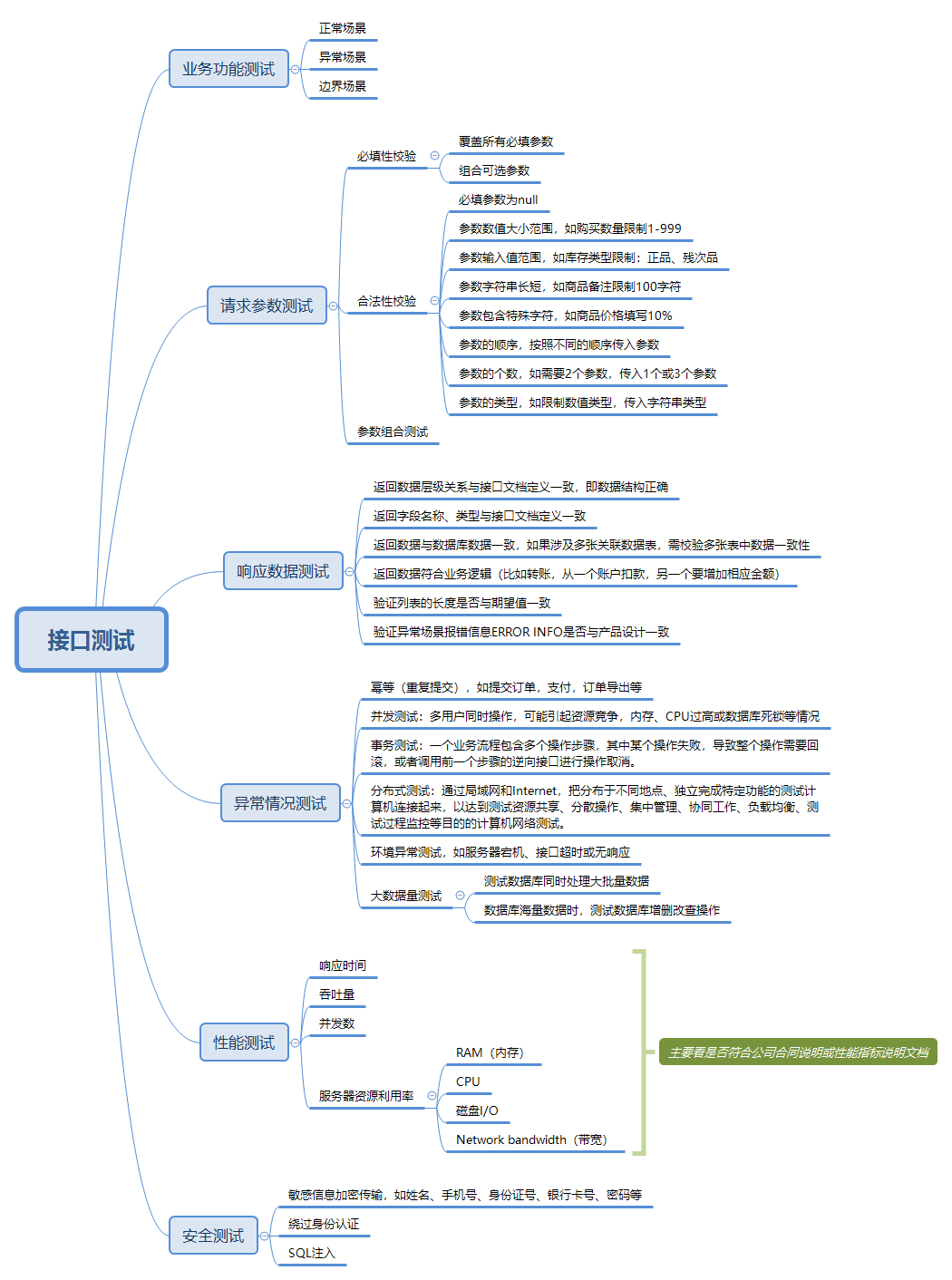 换句话说,接口测试,需要测试什么呢?下面给大家画了一个思维导图,便于理解和记忆。
