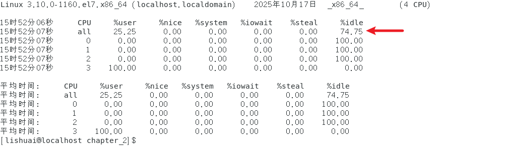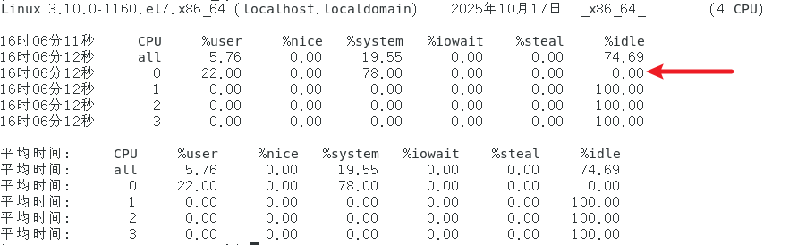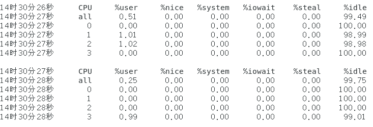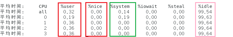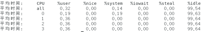 从上图我们可以看到,每一行的字段的值的总和是100%,一行数据对应一个CPU核心,这里输出是我执行命令搭载的4个核心的数据(all的那一行数据是全部CPU核心的平均值)