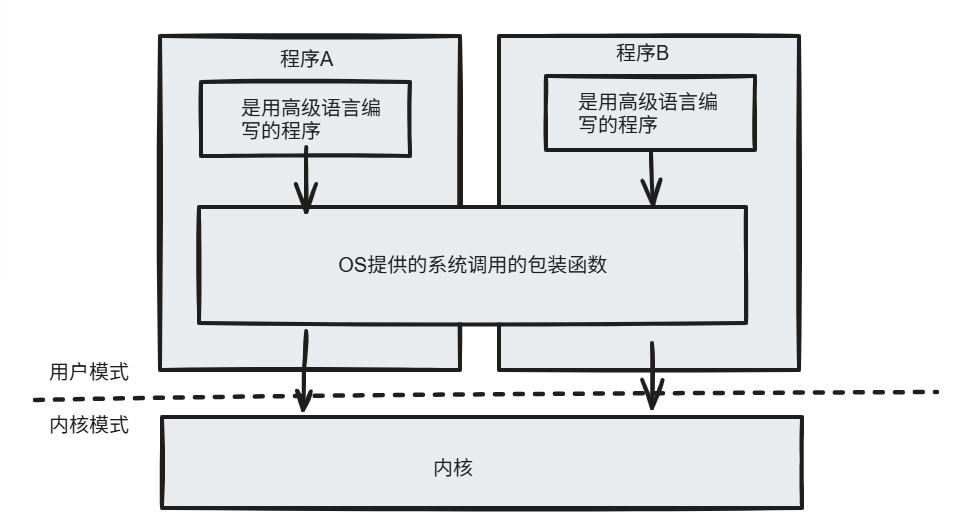 为例解决这样的问题,OS提供了一些列系统调用的包装函数的函数,高级编程语言调用这些函数就行