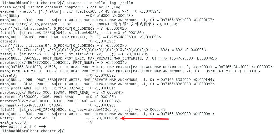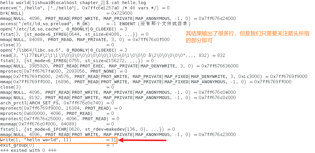 程序和上次运行一样,接下来,打开hello.log文件,看看strace命令的运行结果