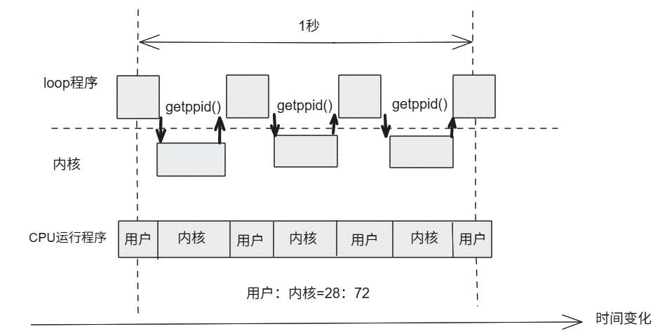 在核心0上,运行ppidloop程序占用28%的运行时间,根据ppidloop程序发出的请求来获取父进程的进程ID这一内核处理占用了72%的运行时间