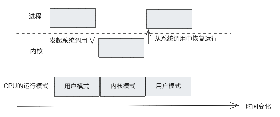 系统调用需要CPU执行特殊的CPU命令来发起,通常进程运行在用户模式下,通过系统调用向内核发送请求时,CPU会发生中断,CPU先用户切换为内核,对请求内容进行处理,等内核处理完所有系统调用后,重新回到用户模式,继续运行进程