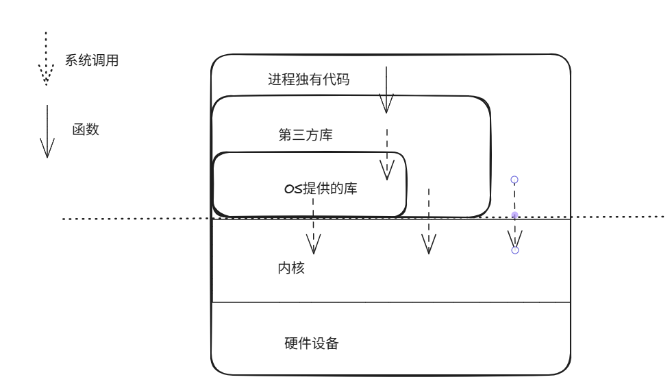 一般来说,由用户模式下运行的进程通过系统调用向内和发送相应的请求,其中存在进程独有代码向内核发送请求的情况,也存在进程所依赖的库向内核发送请求的情况,库分为OS提供的库与第三方库两种类型