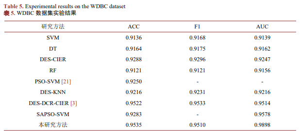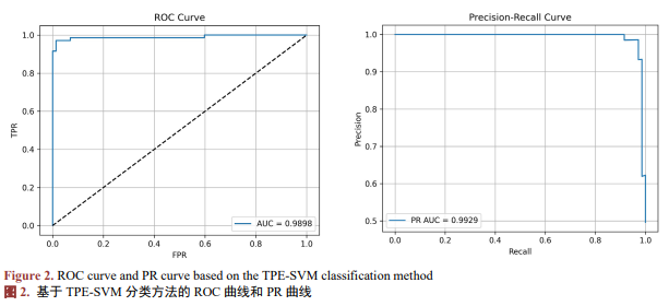 从表5可知,本研究在平衡处理后的WDBC数据集上,采用引入代价敏感机制的TPE-SVM模型进行分类实验,整体分类准确率为95.35%,F1分数为0.9510。如图2所示,模型的ROC曲线下面积(AUC)高达0.9898,取得了良好的表现。如图3所示,该模型的PR-AUC达到0.9929,模型对恶性肿瘤的预测精度为0.9848,F1分数为0.9489,表明模型在保持高检测准确性的同时,具备对恶性样本的高度敏感性。