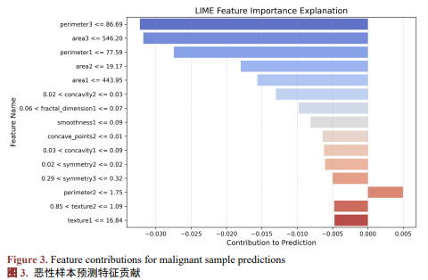 研究在WDBC乳腺癌数据集上进行的数值实验表明,本文模型在准确率、F1-score、AUC值等指标上均表现良好,特别是对恶性肿瘤具有超强的识别能力。LIME可解释性分析可以准确识别出对分类判断影响最大的特征,这些结果与临床的医学知识高度符合,进一步佐证了模型的决策依据与医学知识的一致性,提升了模型诊断的用户信任度。