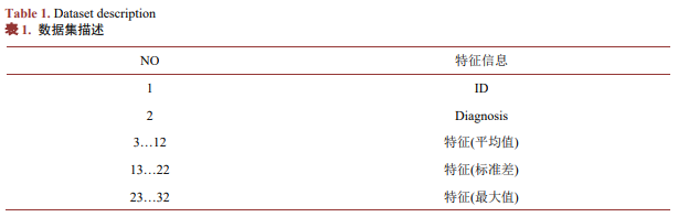 本文采用UCI数据库中具有代表性的威斯康星医学院乳腺癌数据集(Wisconsin Diagnostic Breast Cancer, WDBC)为实验对象,该数据集总共包含569条病例记录,其中良性肿瘤357例,恶性肿瘤212例。每一个病例包含30个特征,涵盖10个实值特征的平均值、标准差和最大值,如表1所示: