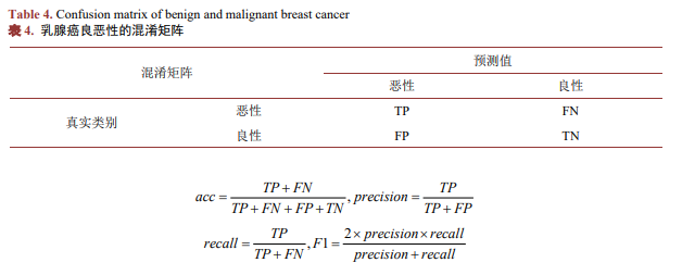 为了验证本研究提出模型的性能,本文分别从模型效果评估、参数优化评估、可解释性分析三个层面进行结果分析。乳腺癌良恶性对应混淆矩阵如表4所示,由表4得各指标计算方式如下: