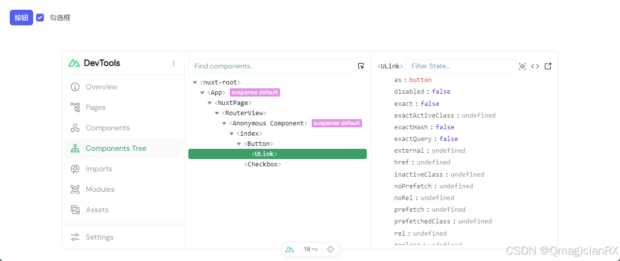 </script><template><div class="flex items-center p-5"><UButton>按钮</UButton><UCheckbox class="pl-1.5" v-model="selected" name="notifications" label="勾选框" /></div>