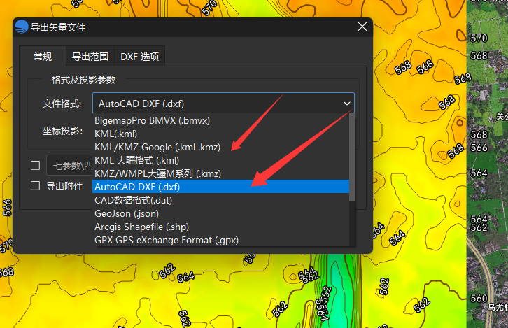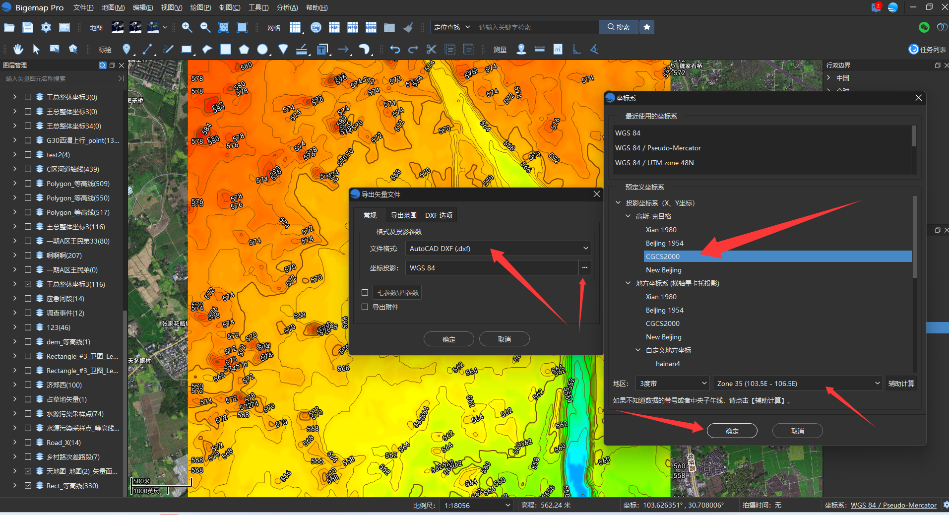 这里选择导出 CAD格式的 DXF,然后选择CGCS2000坐标系, 坐标系的分度带 或者 中央子午线 会自动选择,不用操作,