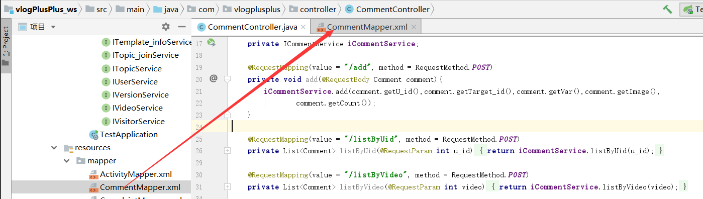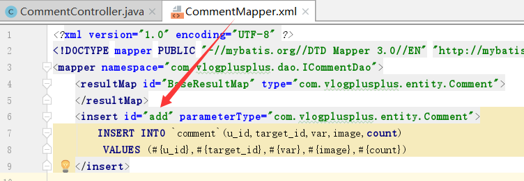 先去resources目录下的mapper目录下打开对应的Mapper.xml文件夹,这里面写的是操作数据库时的SQL语句。可以看到这里有个id为add的语句块,这是add接口收到请求后会执行的SQL语句。