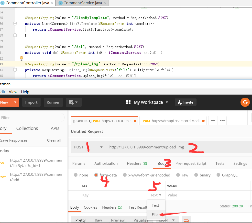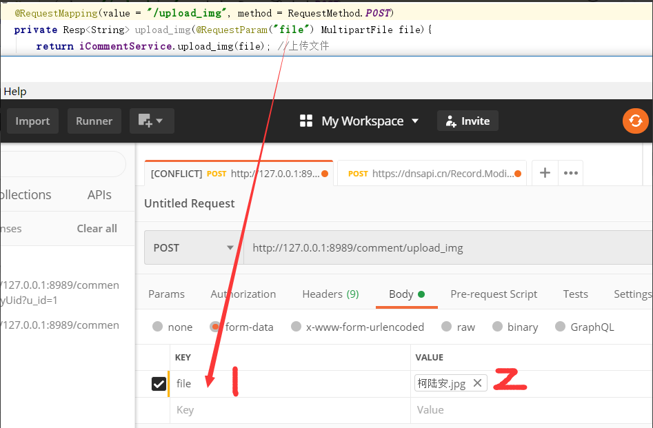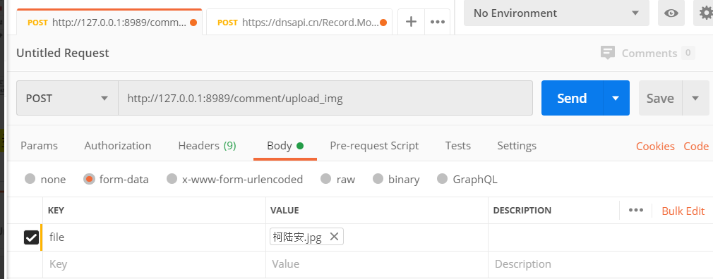 打开postman,选择POST方法,地址栏输入对应的接口的路径,然后选择Body,选择form-data,在KEY这边先选择类型为File。