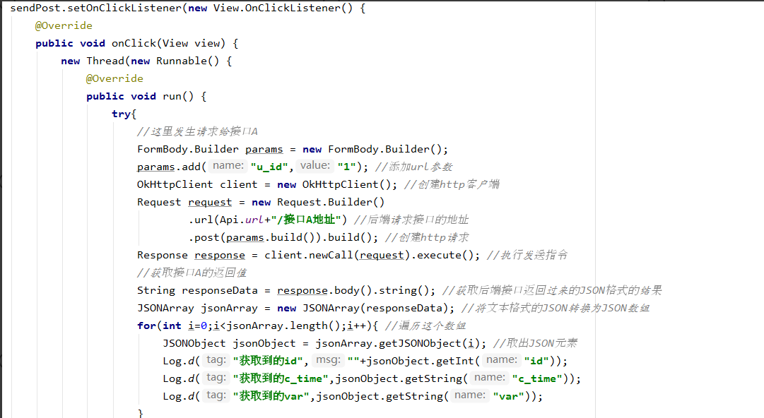 5. 在android studio里写发送post请求的代码。postman的普遍性规律测试通过后,AS里使用后端接口的道理是一样的,postman里怎么发送post请求,AS也跟着学就行了!