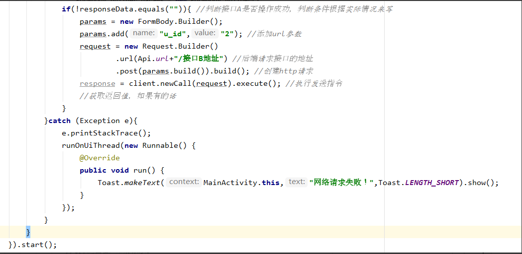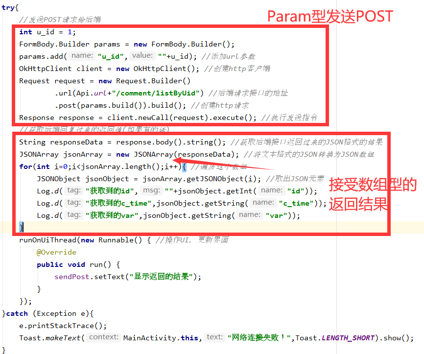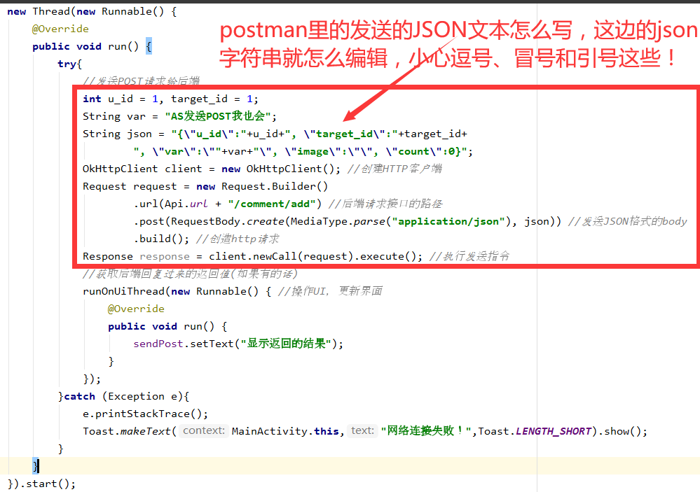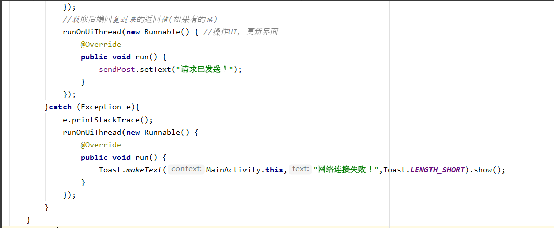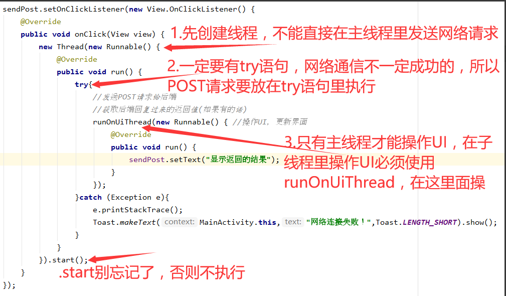 上图例子是按钮按下后发送一个POST请求,首先要创建一个Thread,网络请求操作较慢,所以要在子线程里操作,在主线程里发送网络请求会造成堵塞,APP可能会崩溃的。其次是网络请求的操作要放在try语句里,毕竟网络通信不一定成功的。最后需要注意的是子线程不能直接更新UI,要在子线程里操作UI,需要借助runOnUiThread