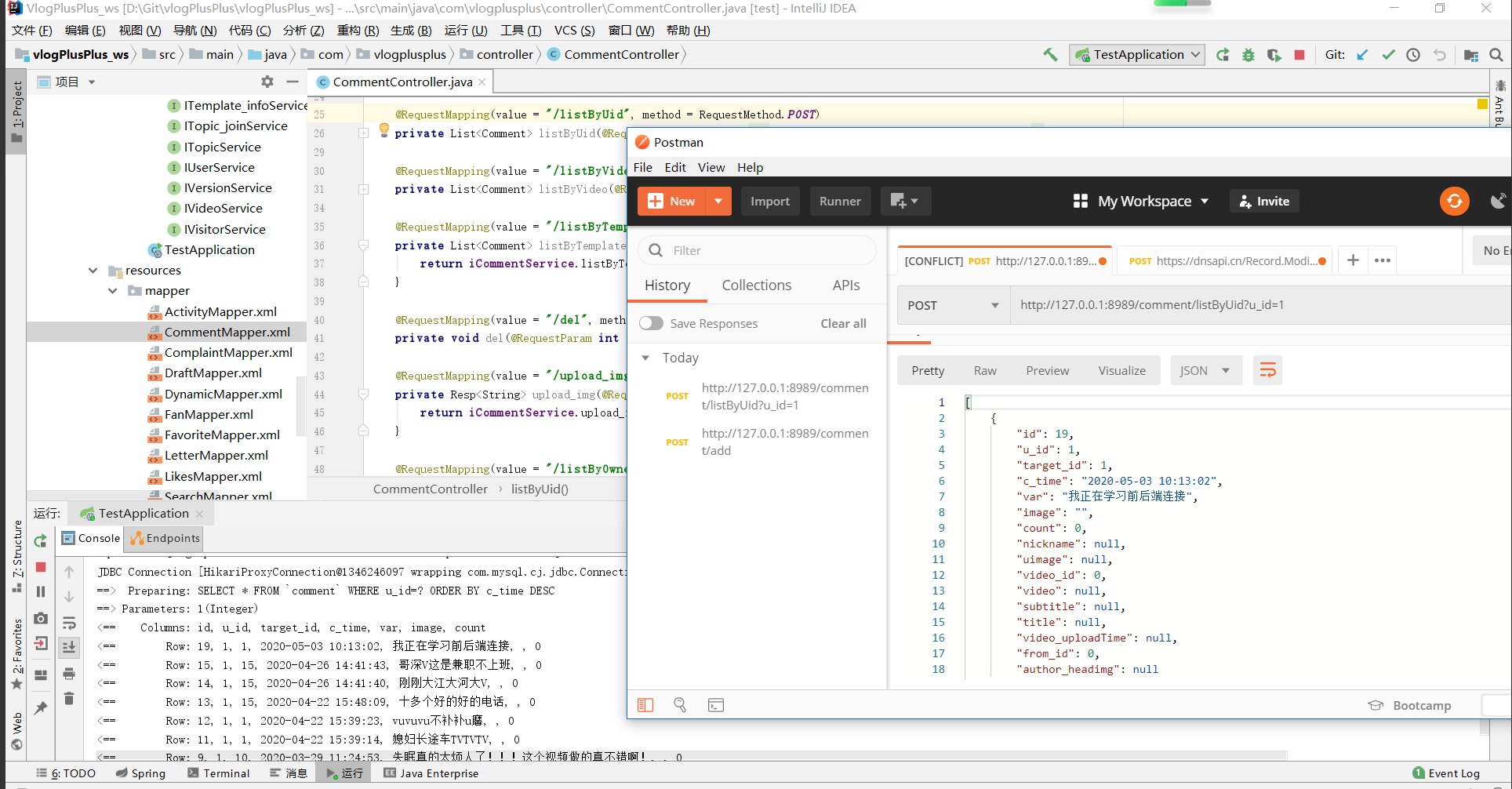 确认无误后点击send按钮,可以看到IDEA运行日志里出现了SQL查询结果,postmna这边的结果区也显示出了JSON格式的结果,这样就成功了!(注意,这里返回的是JSON数组,后面在AS里前端获取返回值时对数组or单个元素的操作是不同的)