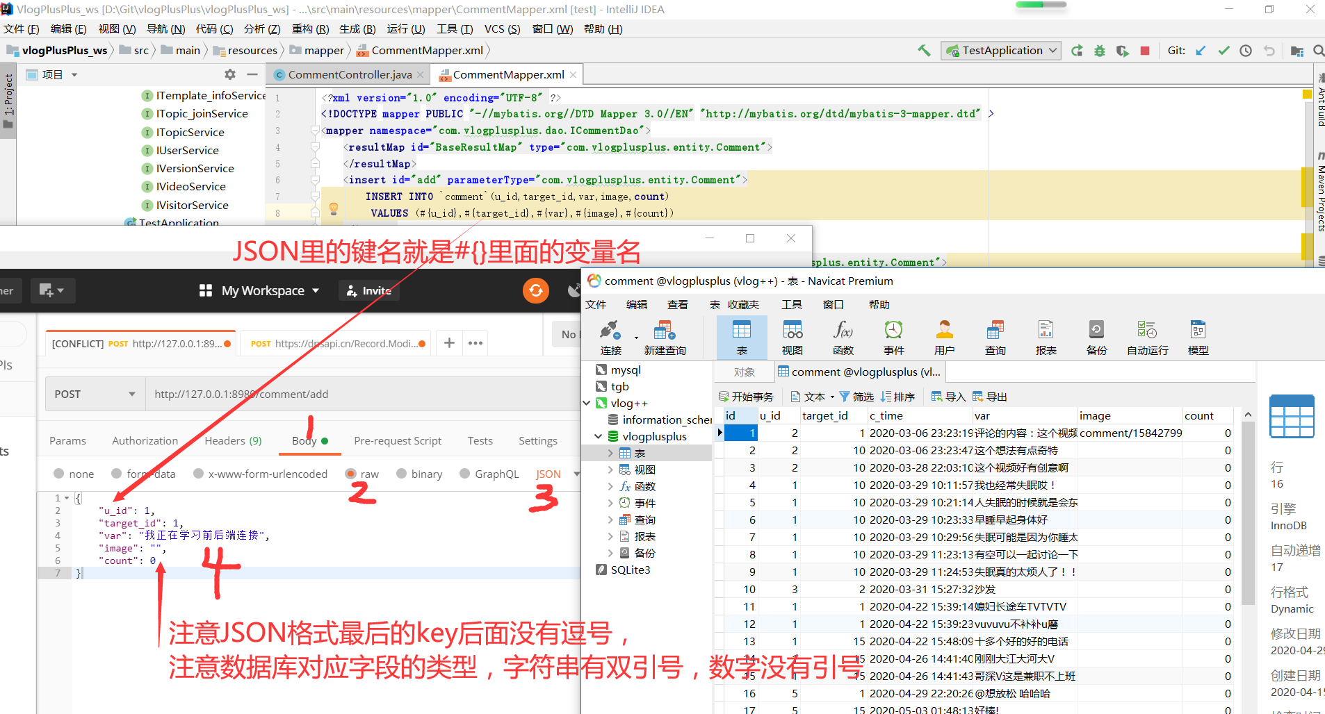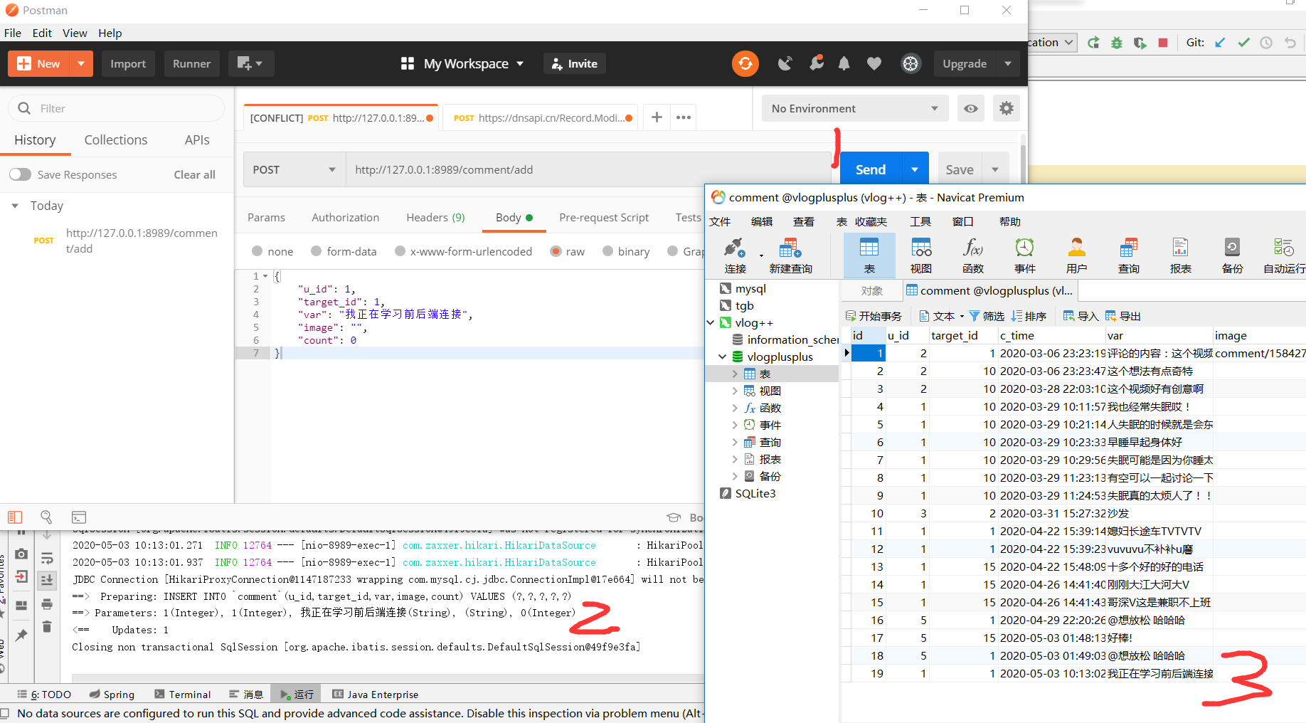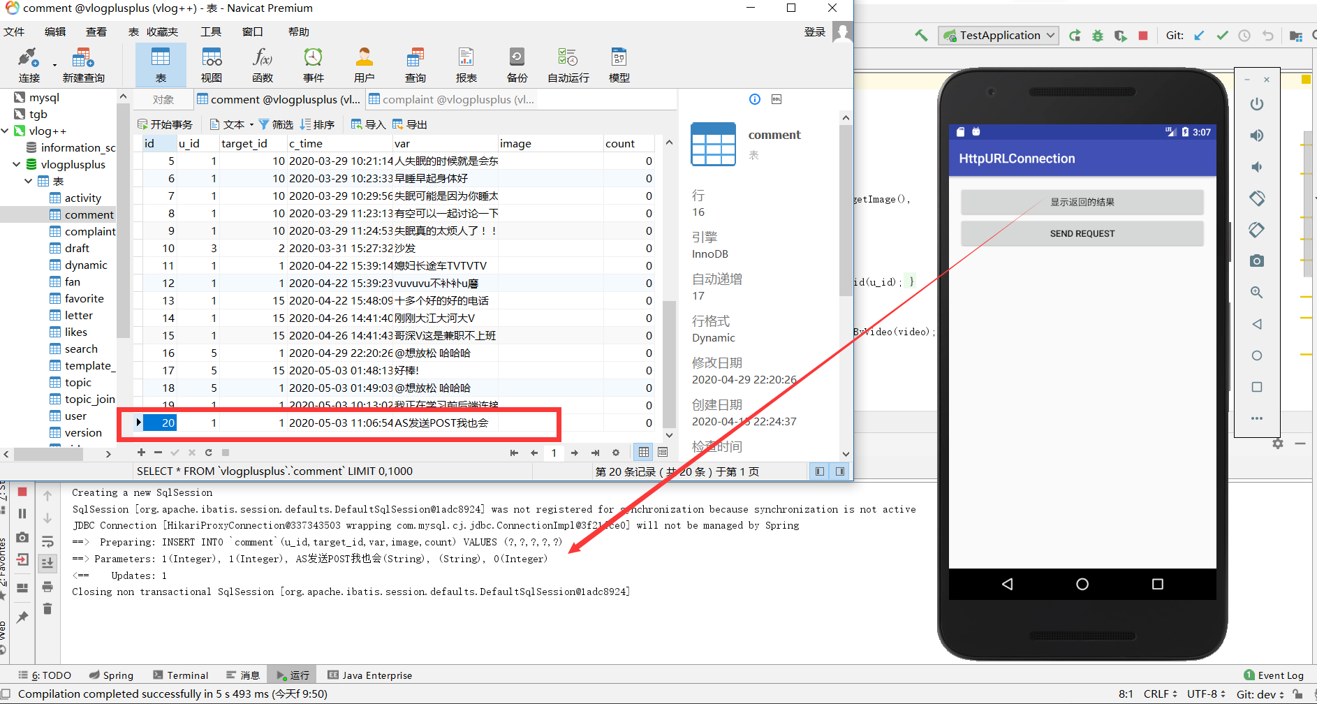 运行一下APP点击对应的按钮发送POST试试,看到IDEA和数据库这边都有反应,成功啦!