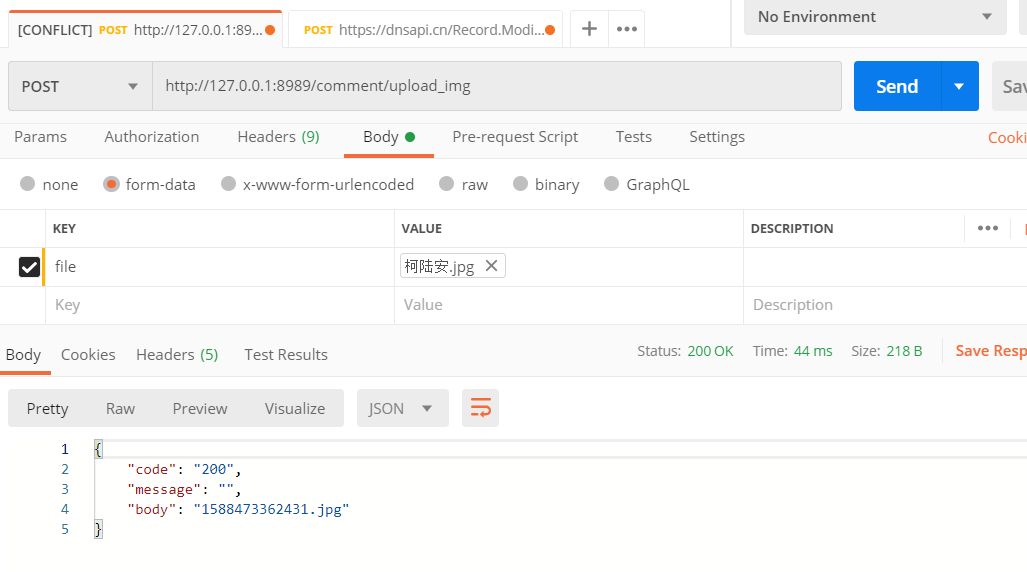 确认无误后,点击send按钮,可以看到postman里收到返回的信息,code200,并且body这边有上传后的文件在服务器上的文件名,这样就成功了!