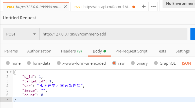 在postman中,先选择Body,然后点击raw,再将格式切换为JSON,在编辑区写出JSON格式的文本,JSON文本中的键名就是SQL语句中#{}里面的变量名,键值就是你要传进去的变量值,这里一定要打开数据库看清楚对应字段的类型。如下图所示: