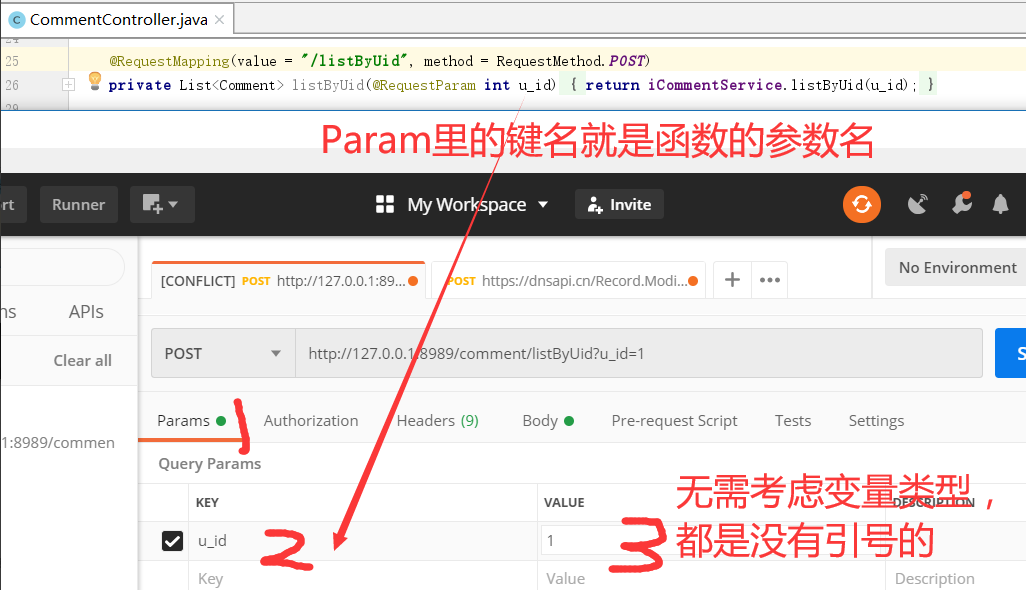 这种类型非常简单,只需要看controller层就行了!在postman中先点击Params,然后在下面添加KEY,这里的KEY就是接口函数的参数,在VALUE里填入你需要传入的值。