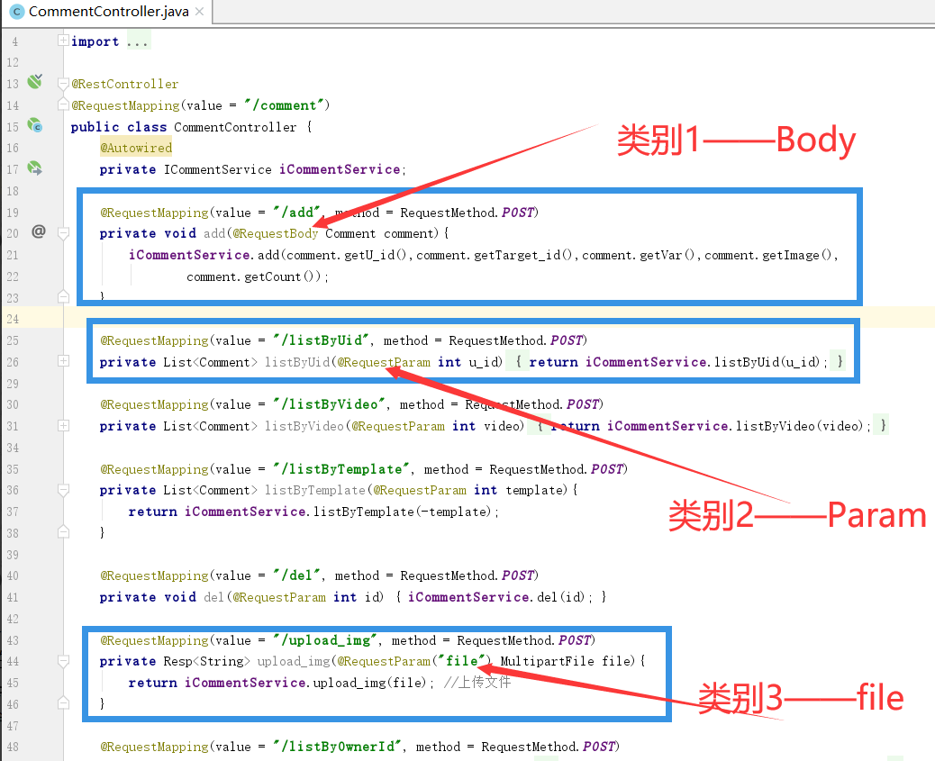 3. 后端接口的类别主要有3种,根据接口函数的参数前方@的不同分别@RequestBody、@RequestParam和上传文件型。如下图所示