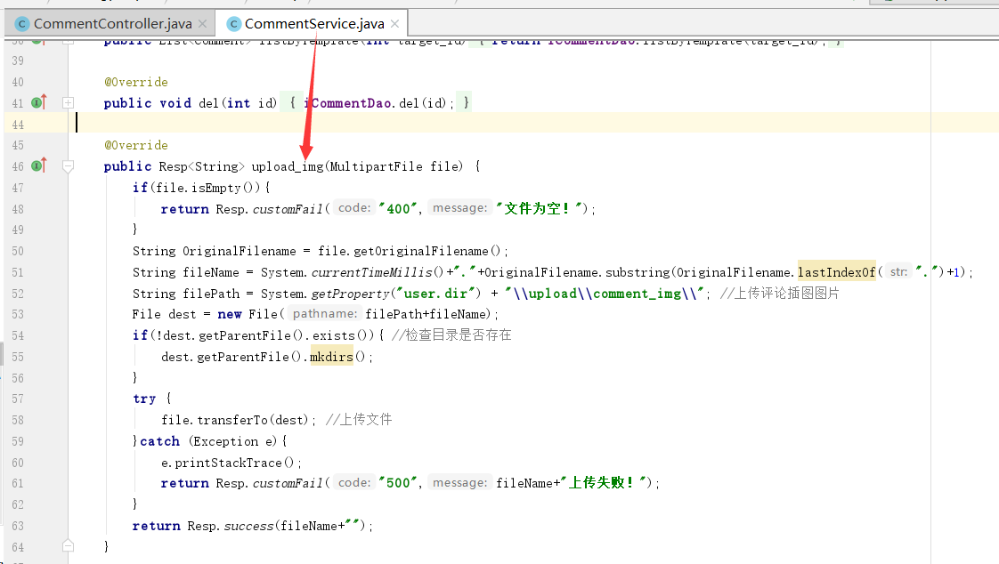 这种类型的接口需要看controller层和service层,请同时打开service文件夹下的impl文件夹下的对应的Service文件!下图所示是service层中找到的对应操作的函数,可见文件会被上传到后端工程文件夹下的upload文件夹下的comment_img文件夹下