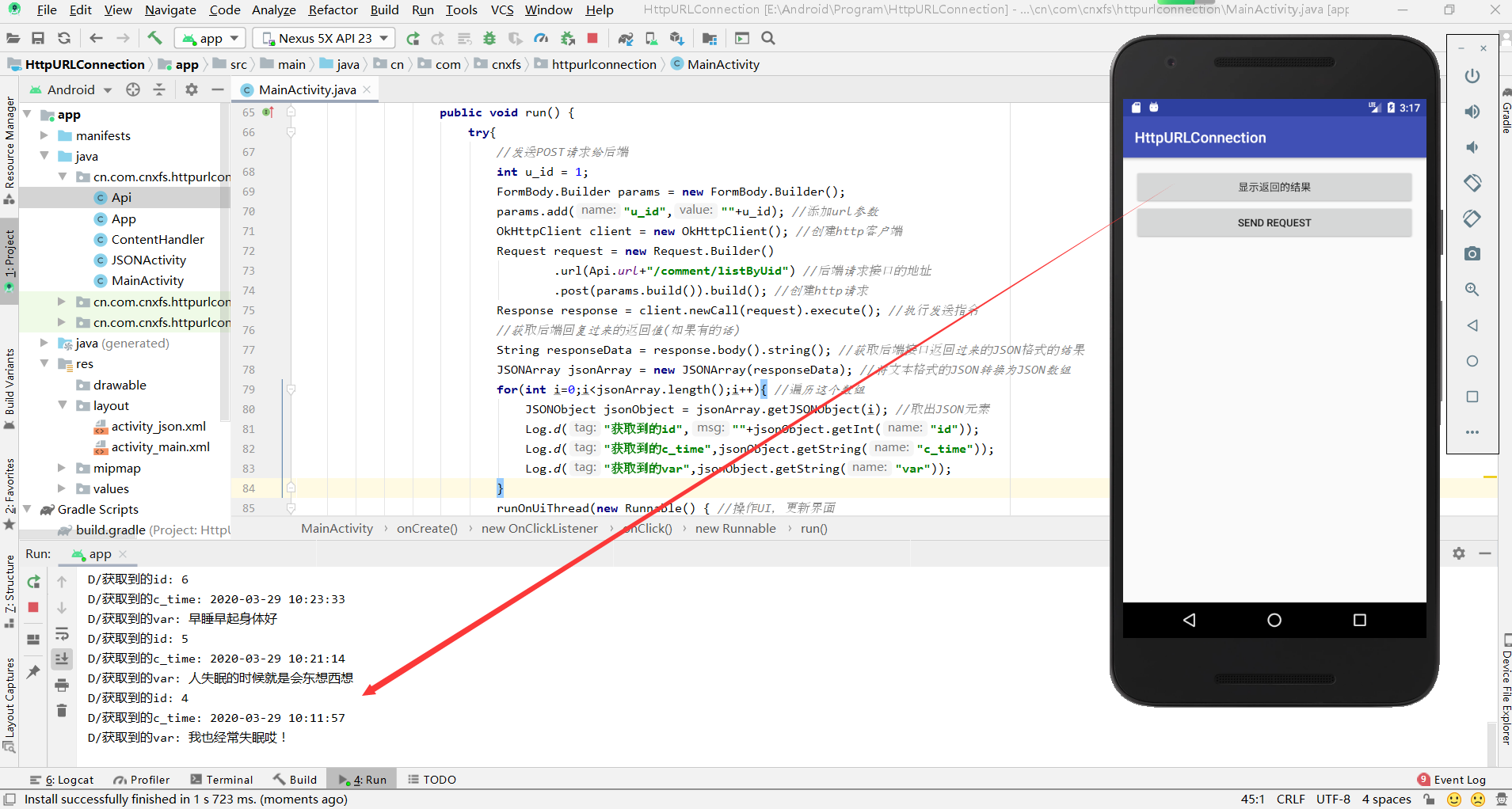 运行APP,点击对应的按钮试试,发现AS的日志里成功打印出从后端获取过来的值,成功!