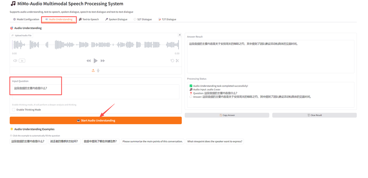 上传一段音频,在「input Question」中输入问题,然后点击「Start Audio Understanding」开始识别。