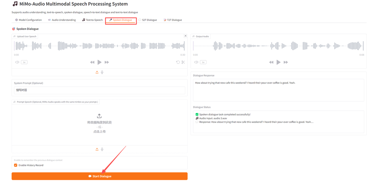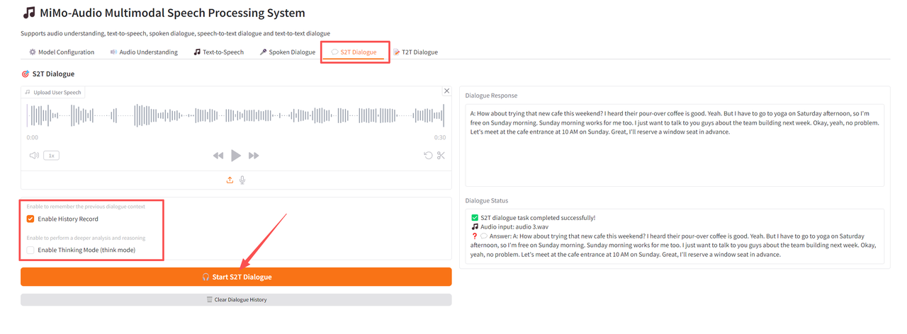 首先上传一段语音,可选择开关历史记录和思考模式,点击「Start S2T Dialogue」开始生成。