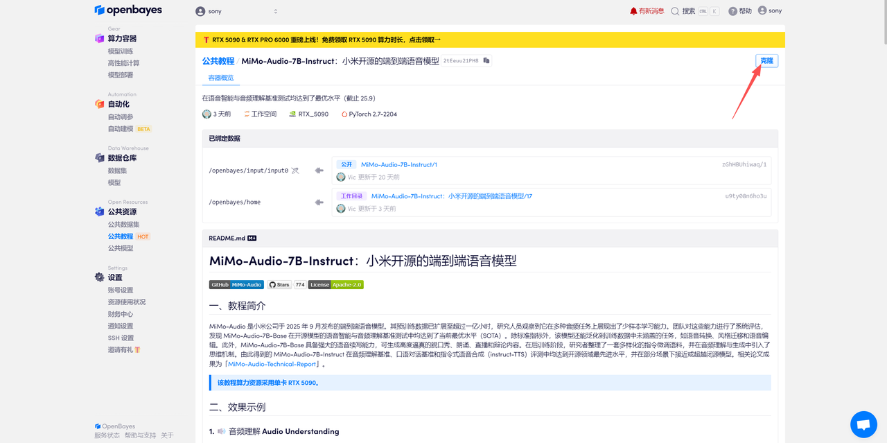 登录 OpenBayes.com,在「公共教程」页面,选择一键部署 「MiMo-Audio-7B-Instruct:小米开源的端到端语音模型」教程。