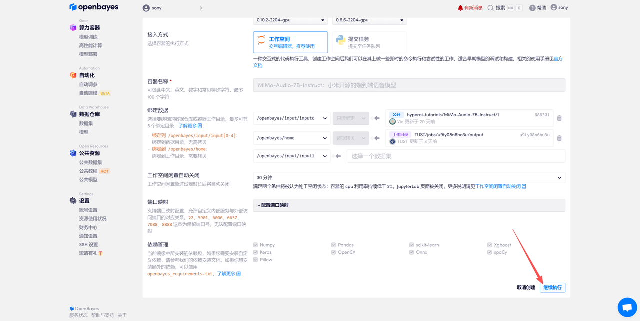 在当前页面中看到的算力资源均可以在平台一键选择使用。平台会默认选配好原教程所使用的算力资源、镜像版本,不需要再进行手动选择。点击「继续执行」,等待分配资源。