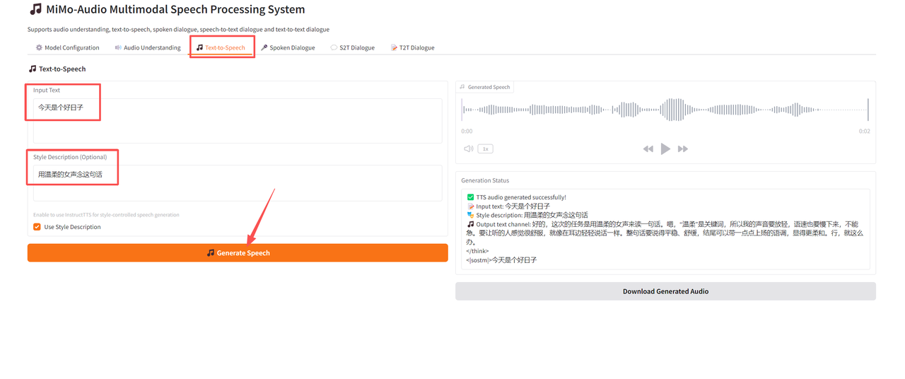 在「Input Text」和「Style Description (Optional)」中分别输入需要转换的内容和音频指令,点击「Generate Speech」开始生成。