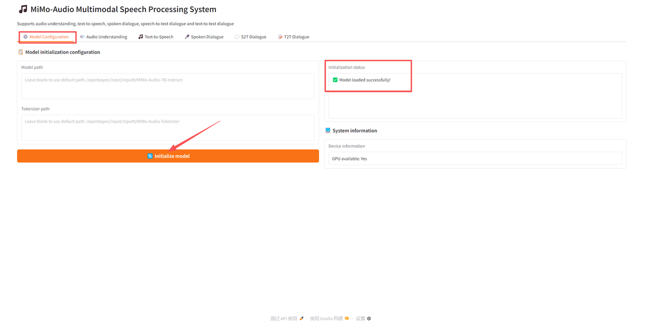 进入 Demo 界面后,首先要初始化权重参数。在「Model Configuration」中使用默认路径,点击「Initialize model」对模型进行初始化。