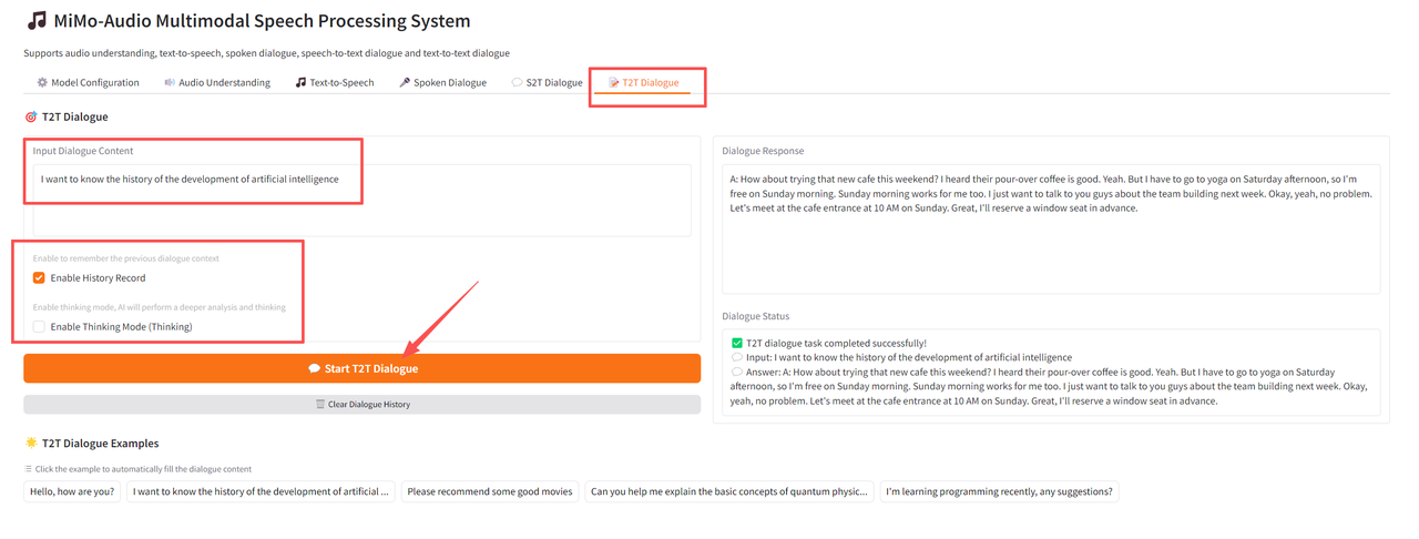 在「Input Dialogue Content」中输入问题,选择开关历史记录和思考模式,点击「Start T2T Dialogue」开始文本对话。