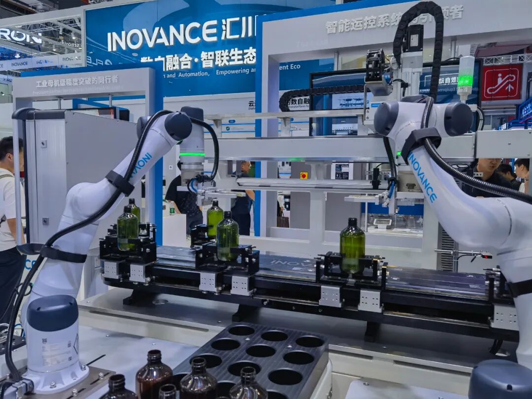 在汇川技术智能机器人生态展示区,覆盖关节执行器的七自由度仿生臂上搭载与桥田联合开发的无动力换枪盘,确保在工具切换时信号、气体等能源的稳定传输。