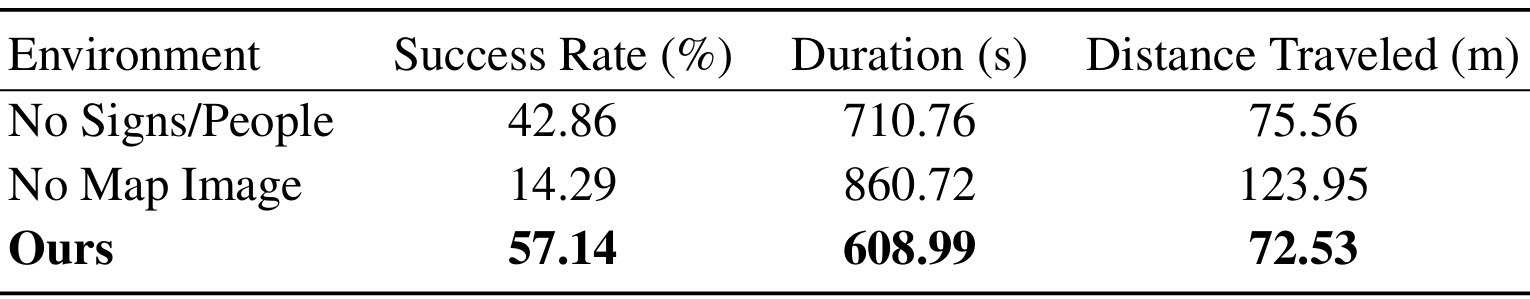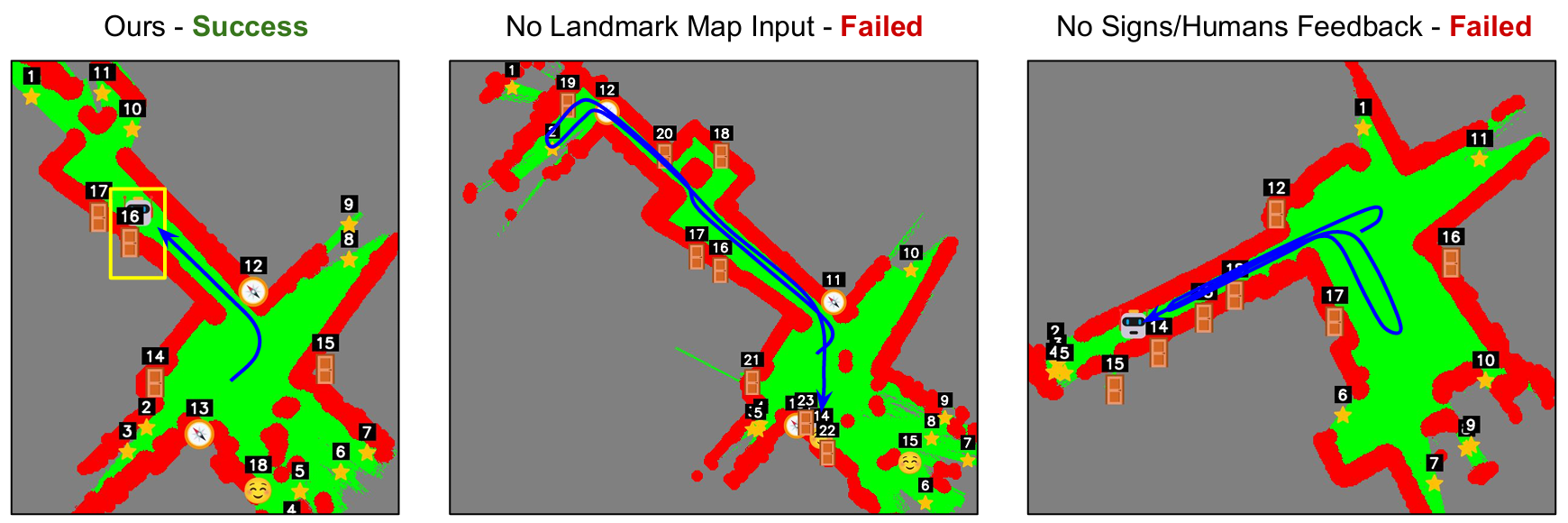 - No Signs/Humans Feedback:在这种基线方法中,不会将标识和人员的信息处理成地标记忆库。因此,VLM无法阅读标识或向人员询问更多信息,它只能看到地图边界和门,并决定访问哪一个。