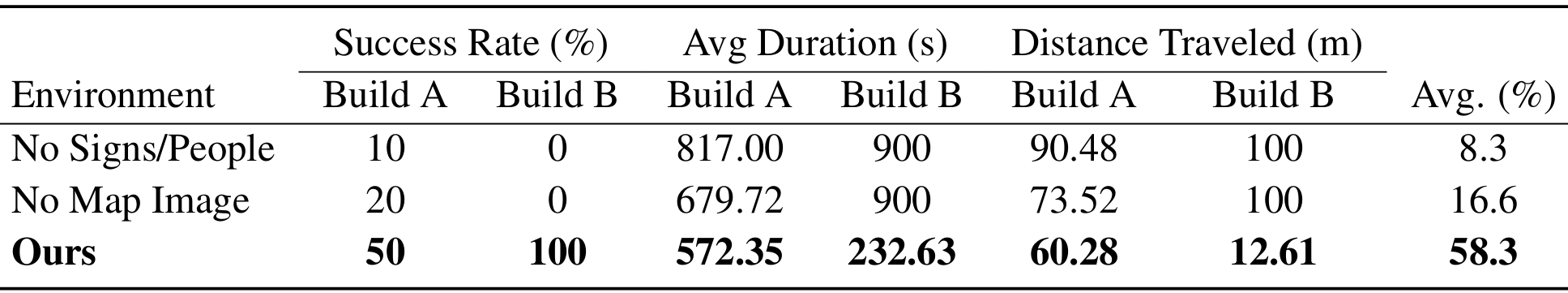 - 基线对比:论文对ReasonNav和基线方法进行了定性比较。结果表明,移除地图图像输入会显著削弱VLM的空间推理能力,使其更容易误解哪些门靠近智能体并值得访问。而移除标识阅读和与人员交流的能力会使智能体更有可能走完全错的方向,导致因超时而失败。