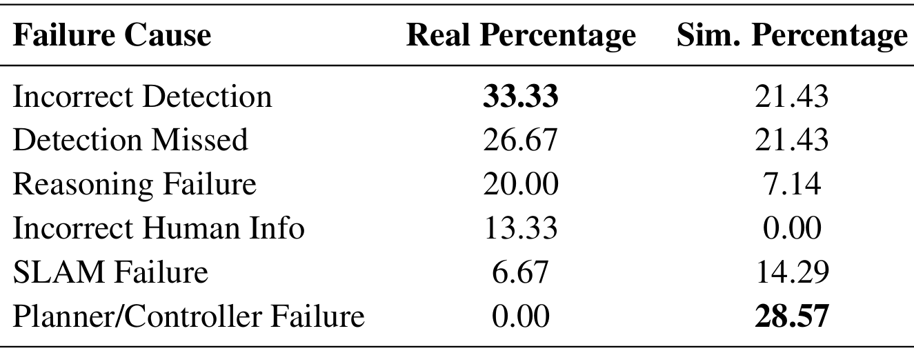 - 真实世界:在真实世界中,检测模块是导致失败的主要原因。海报常被误检测为方向标识或房间标签,导致机器人浪费时间读取它们。此外,还包括检测遗漏和推理失败等情况。