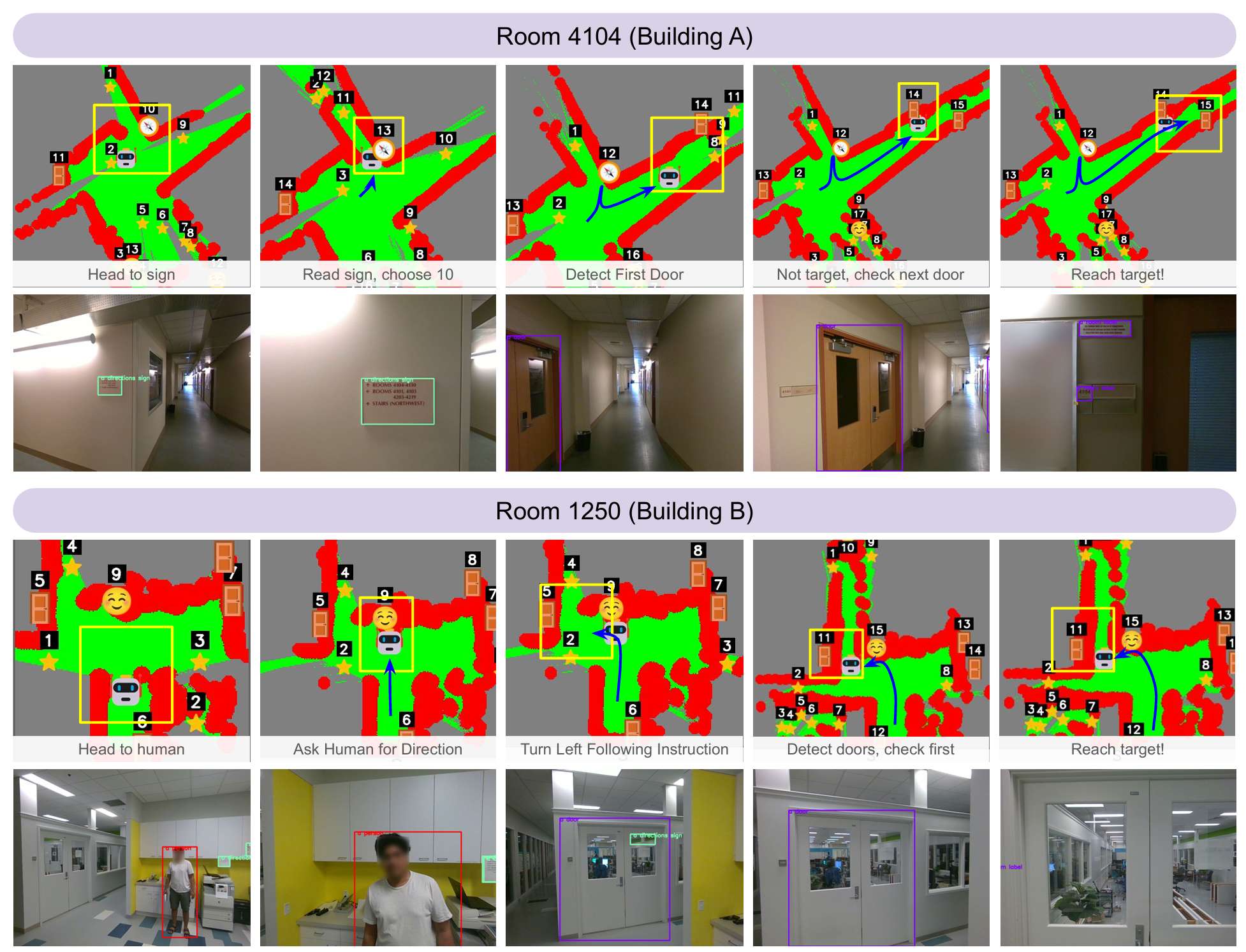 - ReasonNav行为:论文展示了ReasonNav在两个不同真实世界建筑中的完整逐级试验可视化。可以看到,ReasonNav能够成功地阅读标识,理解标识的方向,并利用这些信息选择直接前往目标的边界。类似地,ReasonNav能够向人员询问方向,记录收到的信息,并在后续的高级规划步骤中有效地使用这些信息。