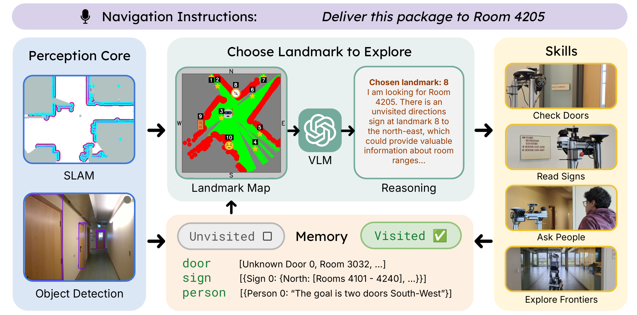 - 随着大型视觉语言模型(VLM)的发展,其在语言理解和推理方面表现出色,为将人类的高阶导航技能整合到机器人导航系统中提供了可能。这些技能包括阅读标识、询问方向等,对于在大型环境中导航尤为重要。