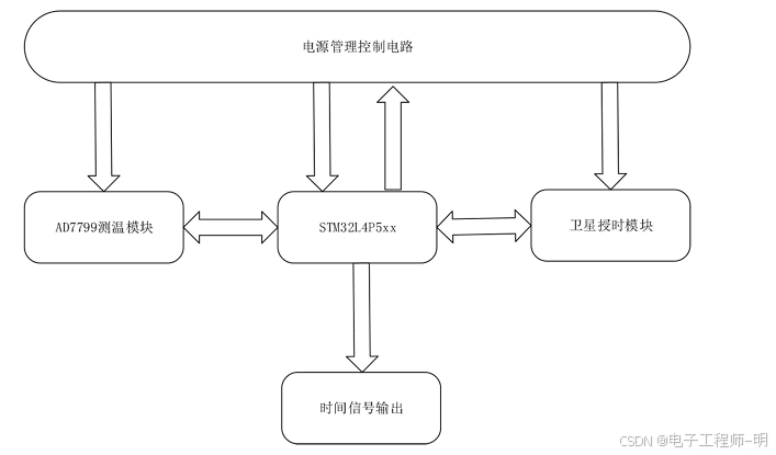 本文将使用Pt1000搭建出一个NTC测温电桥搭配数模转换芯片AD7799作为这个系统的测温系统,其中第一个通道作为基准通道,第二和第三这两个通道作为信号输入。使用低功耗STM32L4P5CGT6P作为主控芯片,通过主控芯片控制测温采样频率、卫星信号接入频率、待机状态下工作状态等多种工作模式,尽可能正在保证时间精准的同时满足低功耗要求。整体设计思路如图所示
