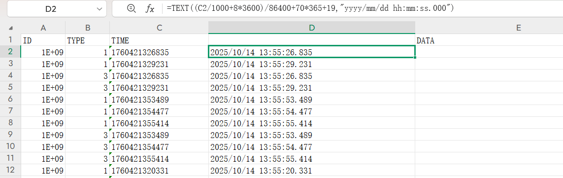 =TEXT((A2/1000+8*3600)/86400+70*365+19,"yyyy/mm/dd hh:mm:ss.000")