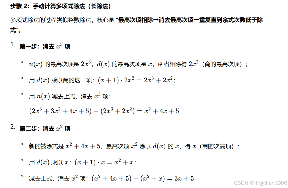 (多项式乘法)的逆运算,其本质是通过解线性方程组求商和余式:
