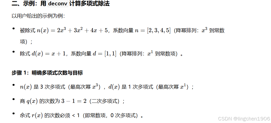 函数用于实现多项式除法,其核心是找到商多项式 \(q(x)\) 和余式 \(r(x)\),满足 “被除式 = 除式 × 商 + 余式”(即 \(n(x) = d(x) \cdot q(x) + r(x)\)),且余式的次数必须低于除式的次数。以下结合具体示例,从数学原理到计算步骤详细讲解: