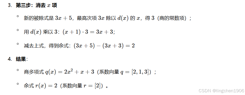 - 余式次数:余式 r 的系数向量长度一定小于 d 的长度(保证次数低于除式)。