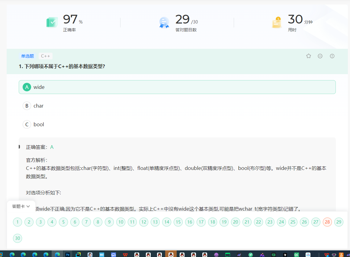 因此A选项wide是不属于C++基本数据类型的选项。知识点:C++