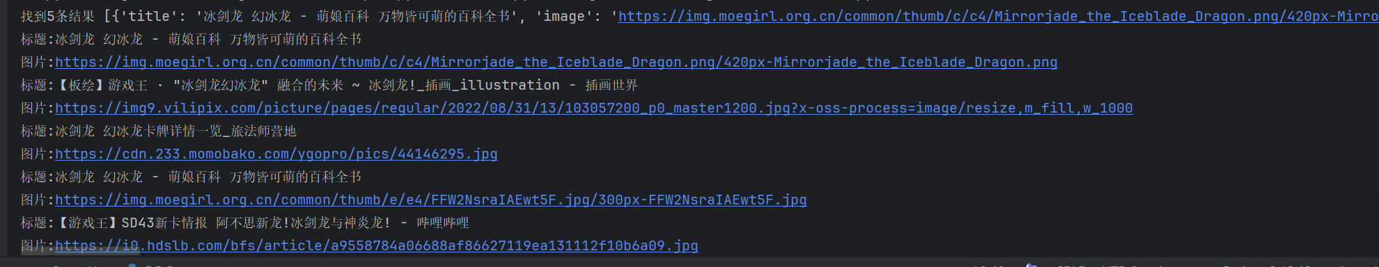 with DDGS() as ddgs:results = ddgs.images('冰剑龙', max_results=3)for result in results:print(f"图⽚标题: {result['title']}")print(f"图⽚URL: {result['image']}")print(f"来源: {result['source']}")print("---")time.sleep(1) # 添加1秒延迟