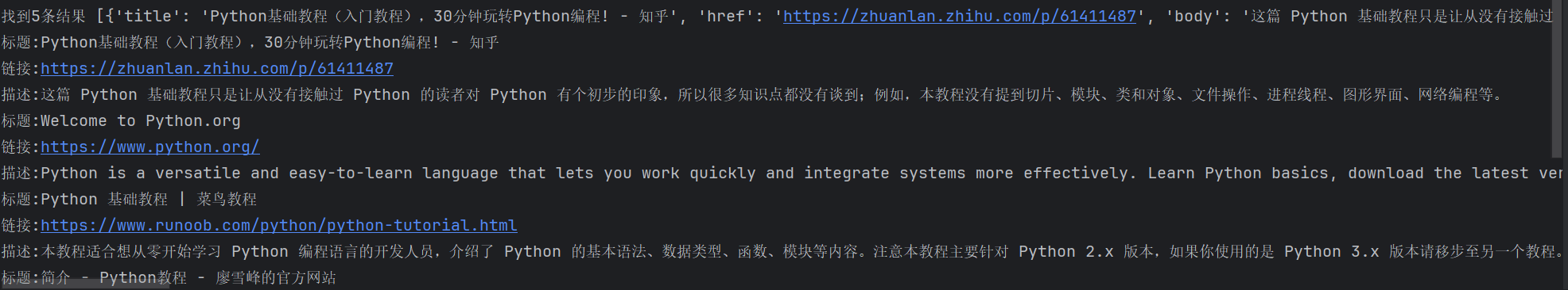 with DDGS() as ddgs:results = ddgs.text('Python 编程', max_results=5)for result in results:print(f"标题: {result['title']}")print(f"链接: {result['href']}")print(f"摘要: {result['body']}")print("---")time.sleep(1) # 添加1秒延迟